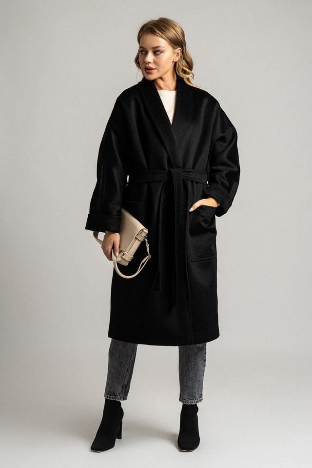 Зимняя модель пальто-кимоно рассчитана на температуру до -10°. Изделие с воротником-шалькой, декоративной строкой, идущей от кисти к кисти через спину, накладными карманами, и отворотами на рукавах. Пальто имеет шлёвки, что минимизирует вероятность потери пояса.